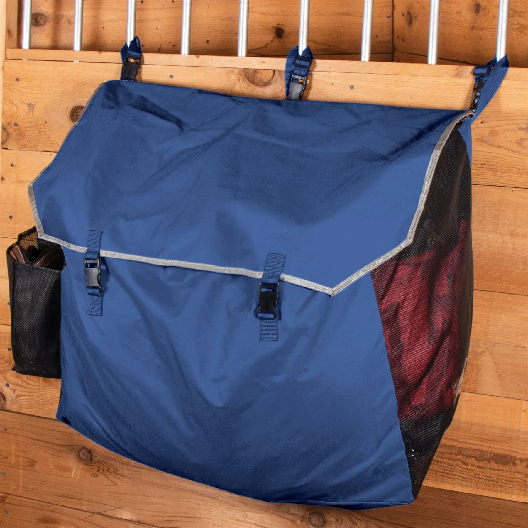 - Featuring a sturdy mesh design, the stall front bag offers excellent ventilation, preventing moisture buildup and keeping your horse blankets fresh and dry. The mesh sides also allow for easy visibility of contents, making it simple to find what you need quickly.