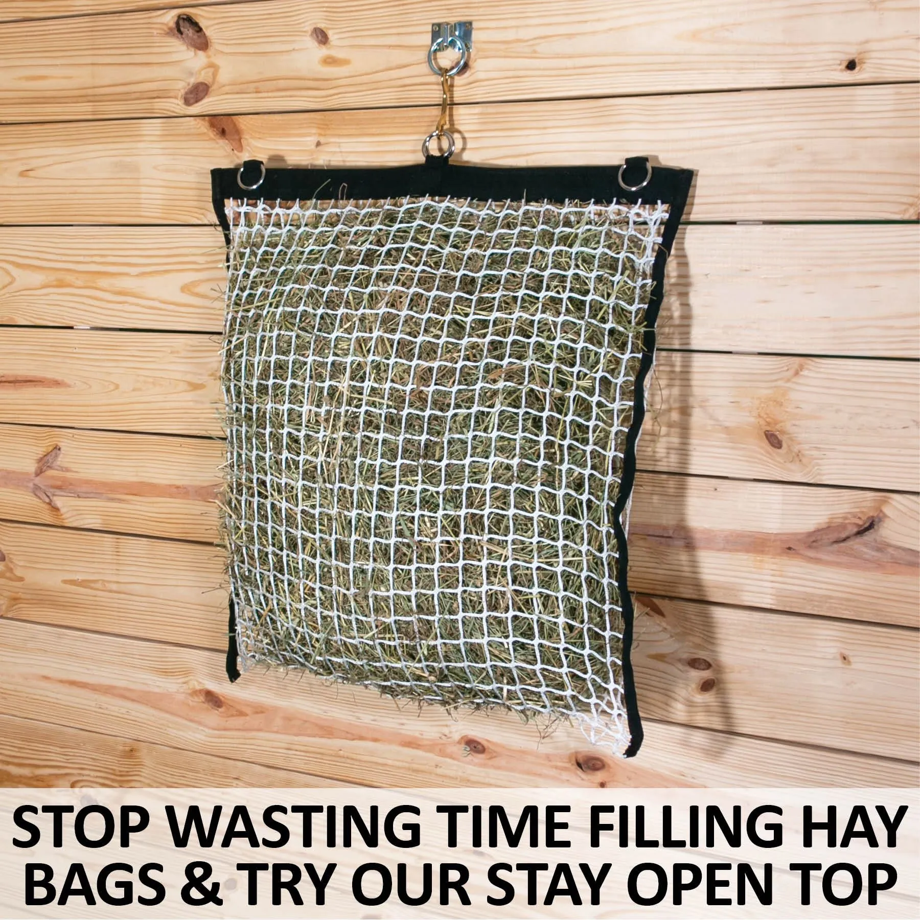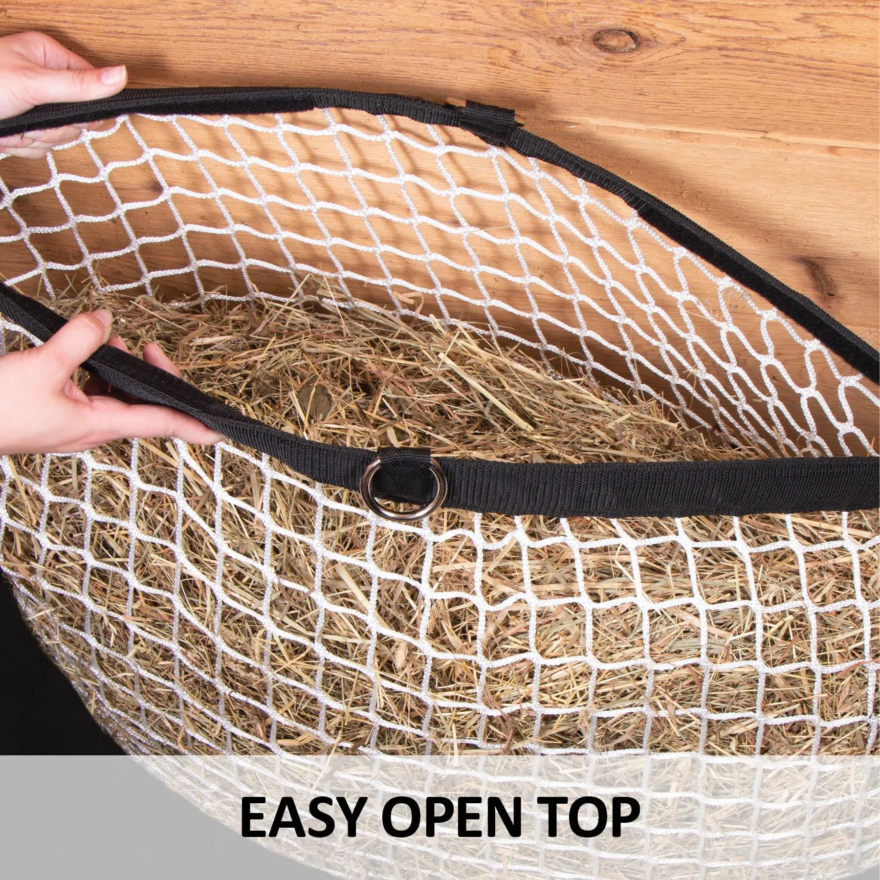 - The Dura-Tech® Easy Open 1.25″ Slow Feed Knotless Hay Net is a premium hay feeder designed for horses, ensuring controlled and slow feeding for optimal digestion.